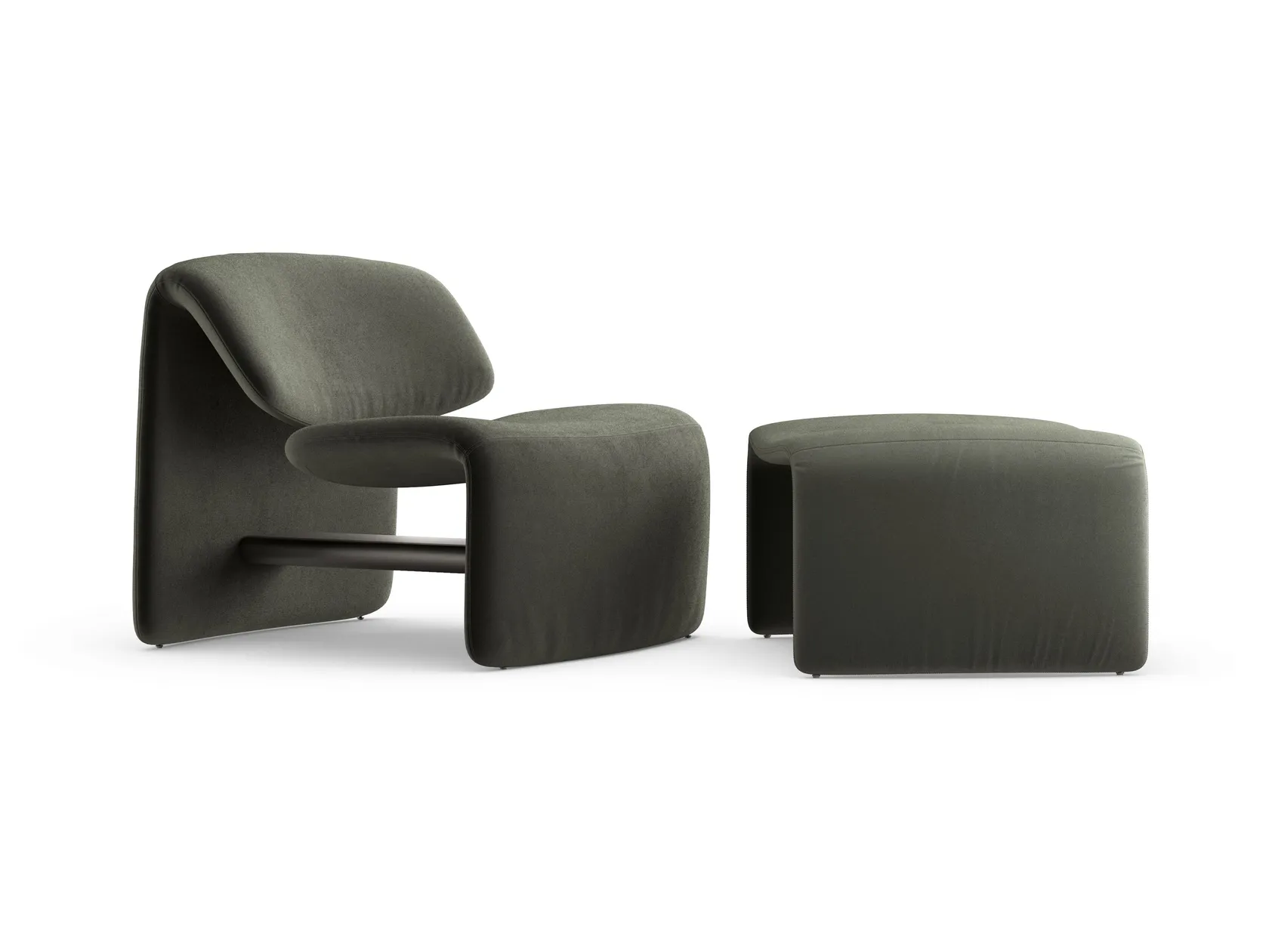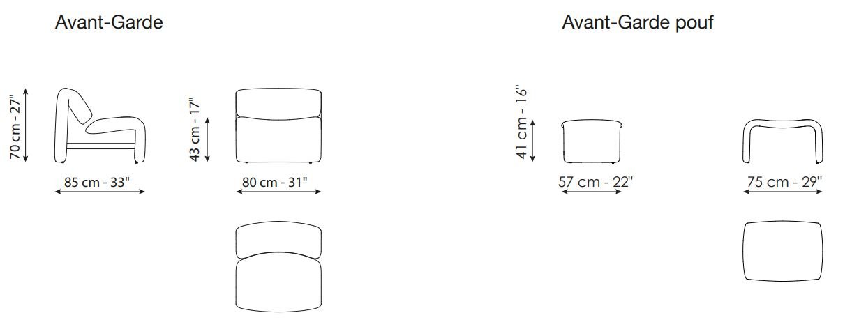 The backrest and seat are two separate pieces made up of single curved lines which are connected to each other by a metal tube. The space between the elements not only lightens the visual perception, but creates an effect of suspension in a subtle interplay of balances. The separation between the seat and backrest is not only an exercise in technical mastery and aesthetic research, but a functional element that gives the frame a delicate flexibility. The two parts adapt naturally to the shape of the body, ensuring optimal comfort and a balanced seating experience. Thanks to its unmistakable style, Avant-Garde stands out as an authentic eye-catcher in spaces intended for a wide range of uses: as such, especially when combined with the pouf, it is perfect for both giving character to a living area with an unconventional spirit, as well as fitting naturally into an elegant waiting room or a hotel lounge.