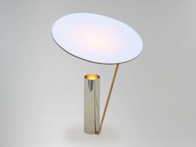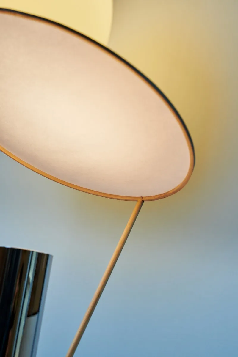 Blue skies is a table lamp composed of a silver base and a Hinoki wood and Tosa-Washi paper reflector. A projected light beam is shot upwards from the base and is caught by the paper shade positioned at an angle directly above. A reflected, meditative glow on a floating disc, highlighting the texture of the paper’s structure. A simple balancing gesture of capturing light which would have otherwise been lost.