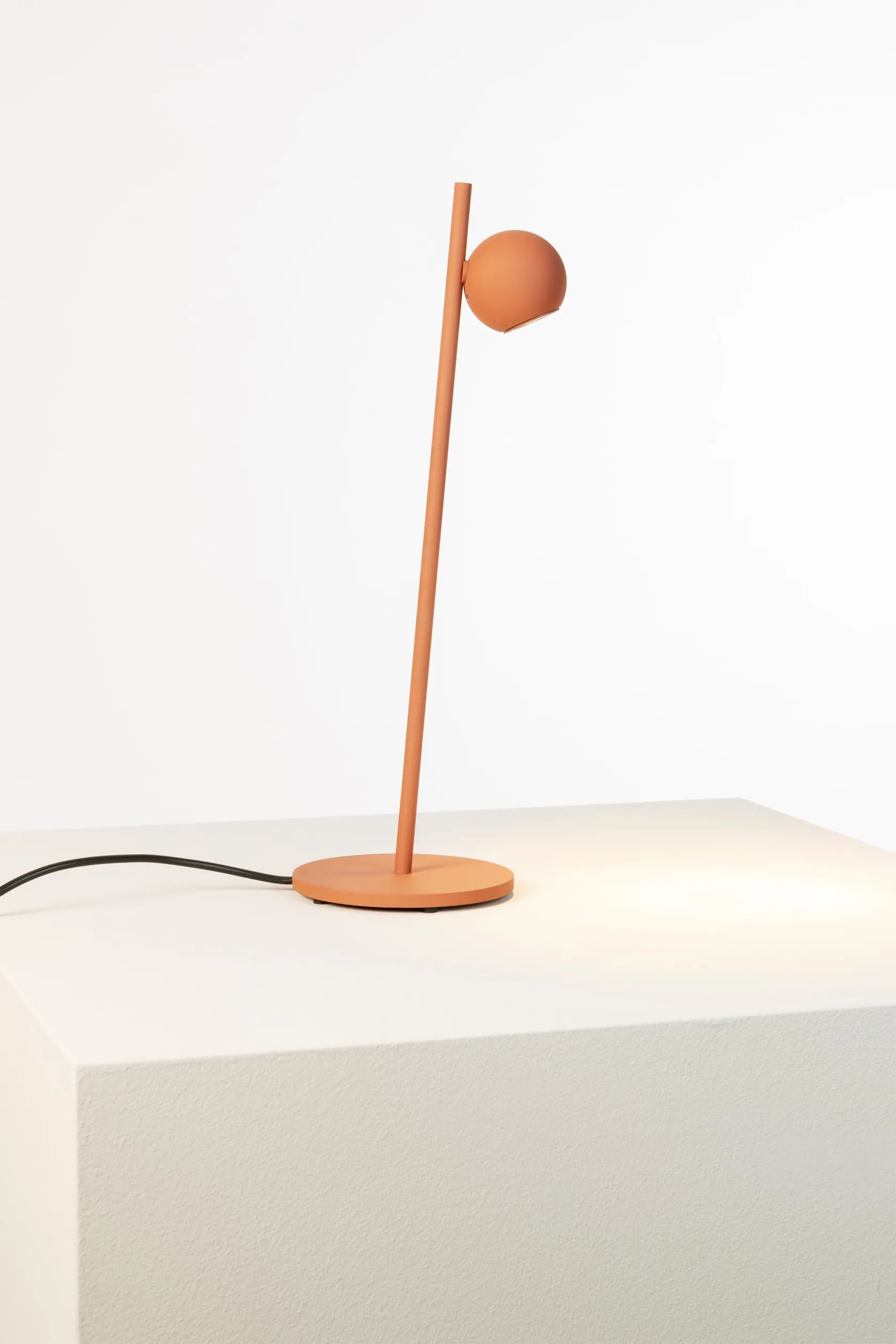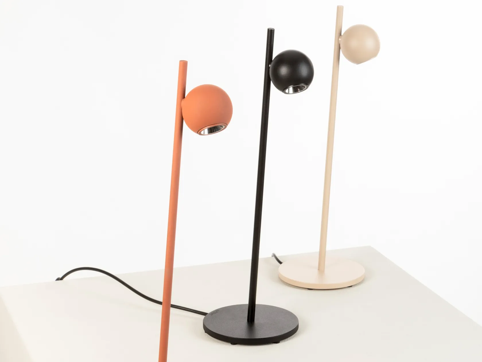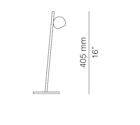 Compass is a metallic table lamp providing direct light. The circular head can rotate 145º horizontally and the vertical stem has a fixed inclination of 5º. Push button dimmer on the cord. Universal plug.