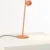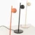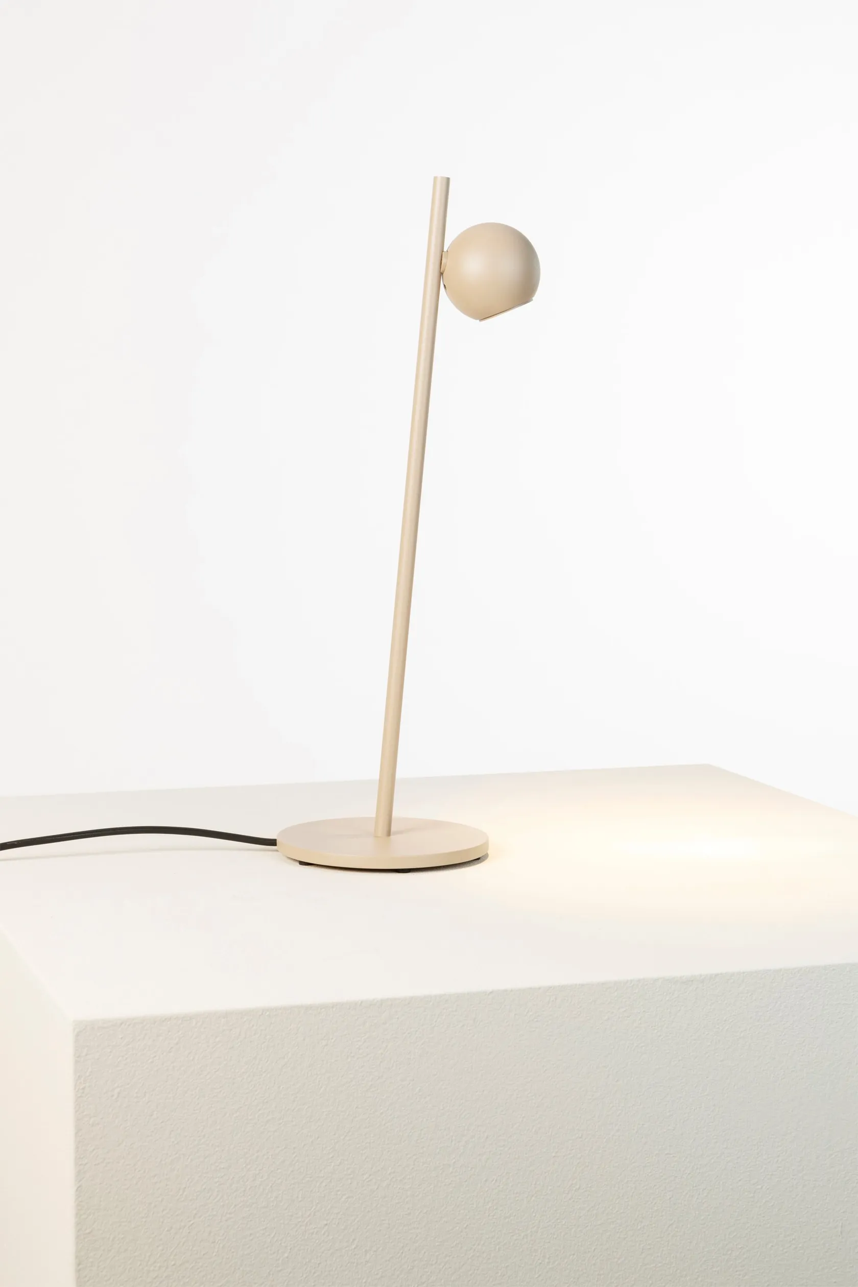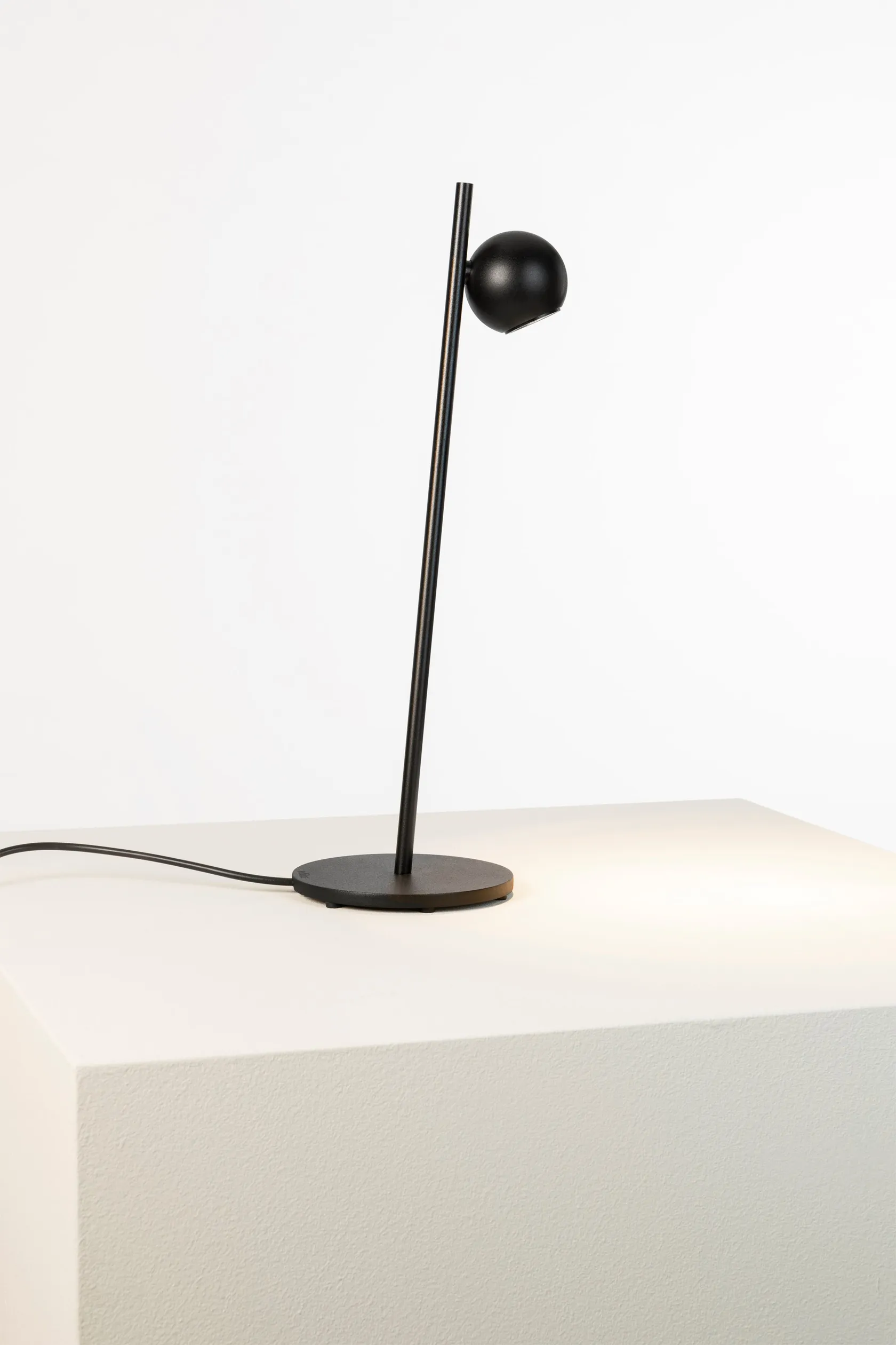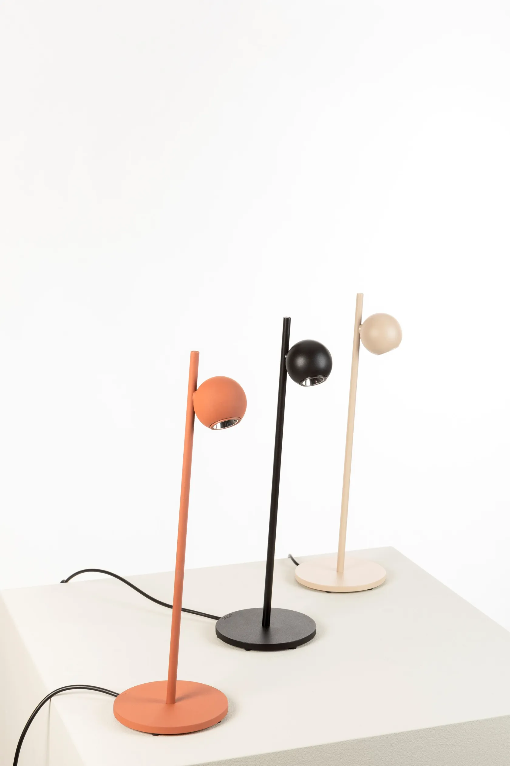 Compass is a metallic table lamp providing direct light. The circular head can rotate 145º horizontally and the vertical stem has a fixed inclination of 5º. Push button dimmer on the cord. Universal plug.