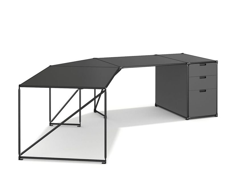 Writing desk with 4-piece work surface, single-sided container with 3 drawers, on angled feet.