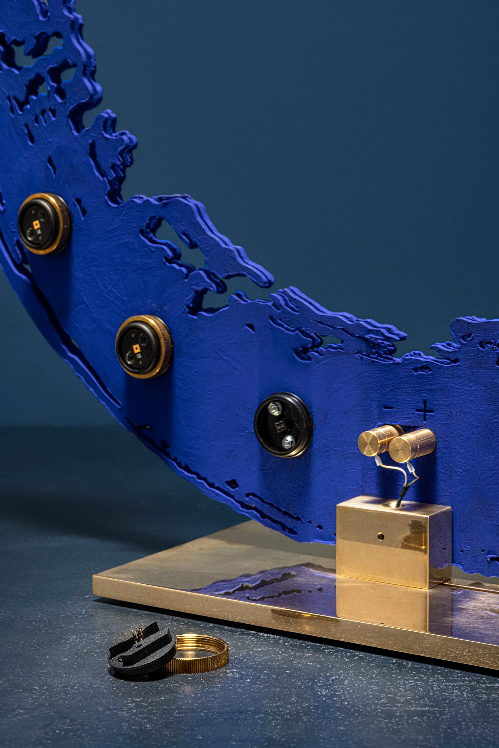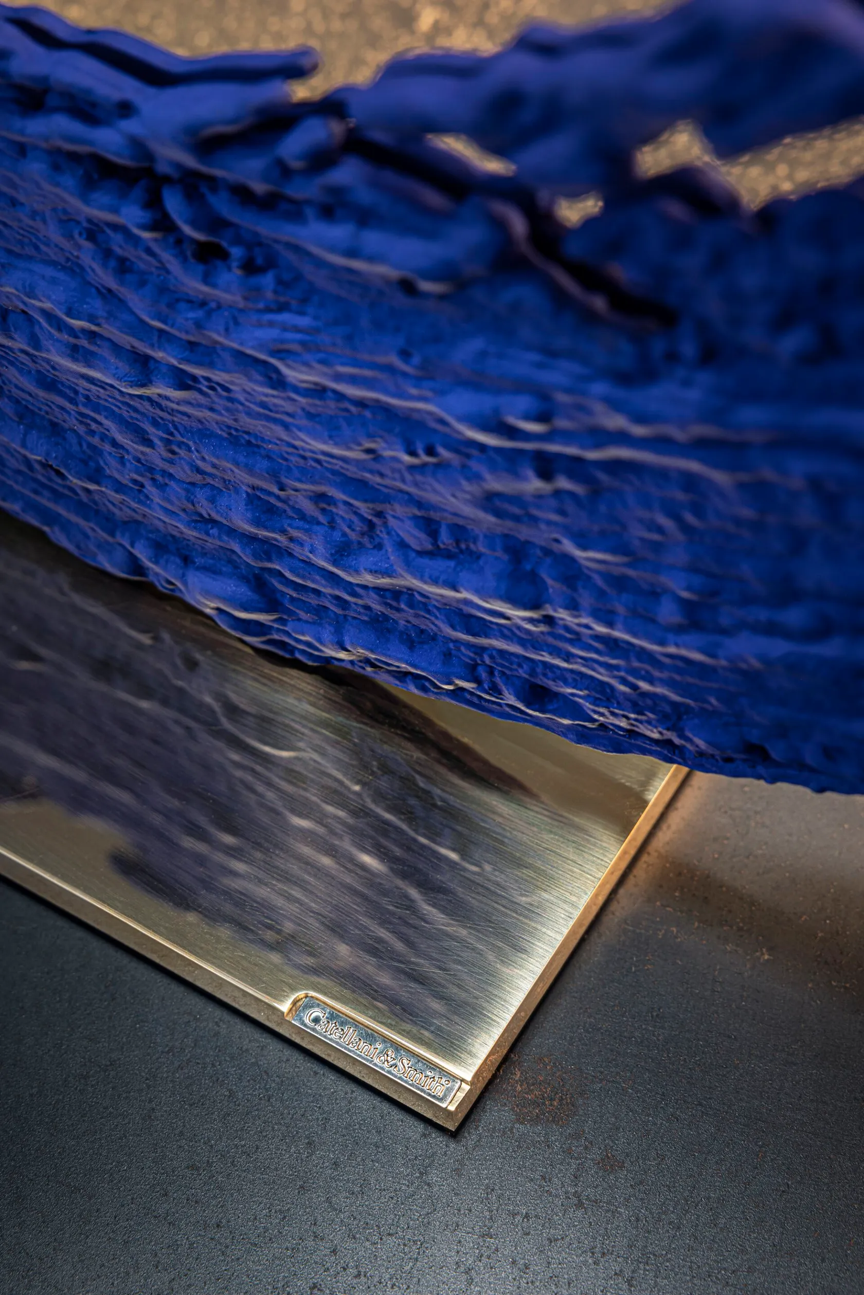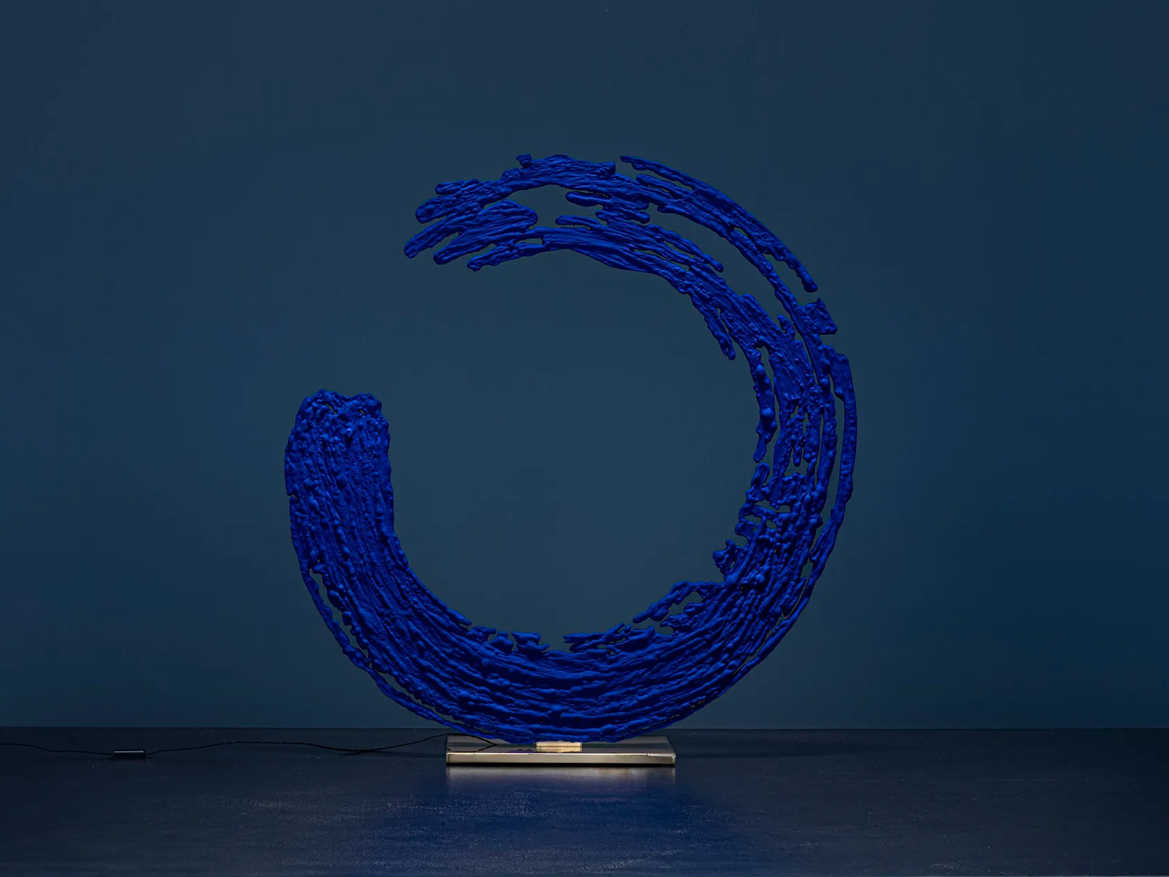 Ensō is a table lamp with brass base and details, metal structure, blue hand painted external irregular surface