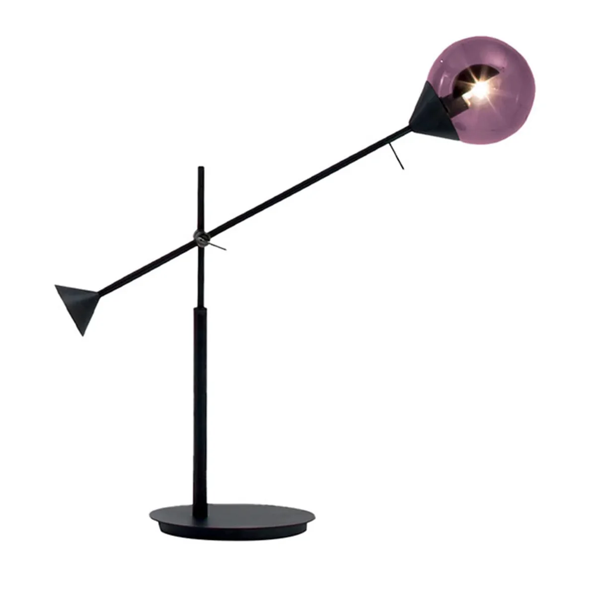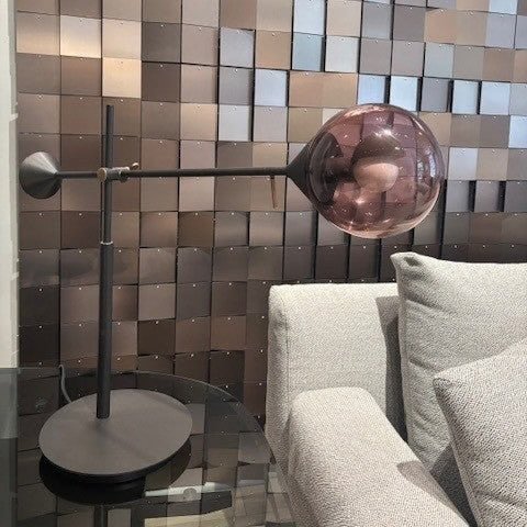 The Floor Sample Kendama Table Lamp features a burnished metal and light structure paired with hand-blown Murano glass spheres.