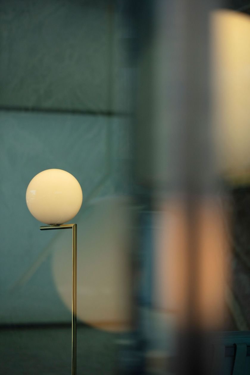 Floor lamp providing diffused light. Frame in brass, brushed and transparent varnished or chrome steel. Blown glass opal diffuser. Dimmer on the power chord.