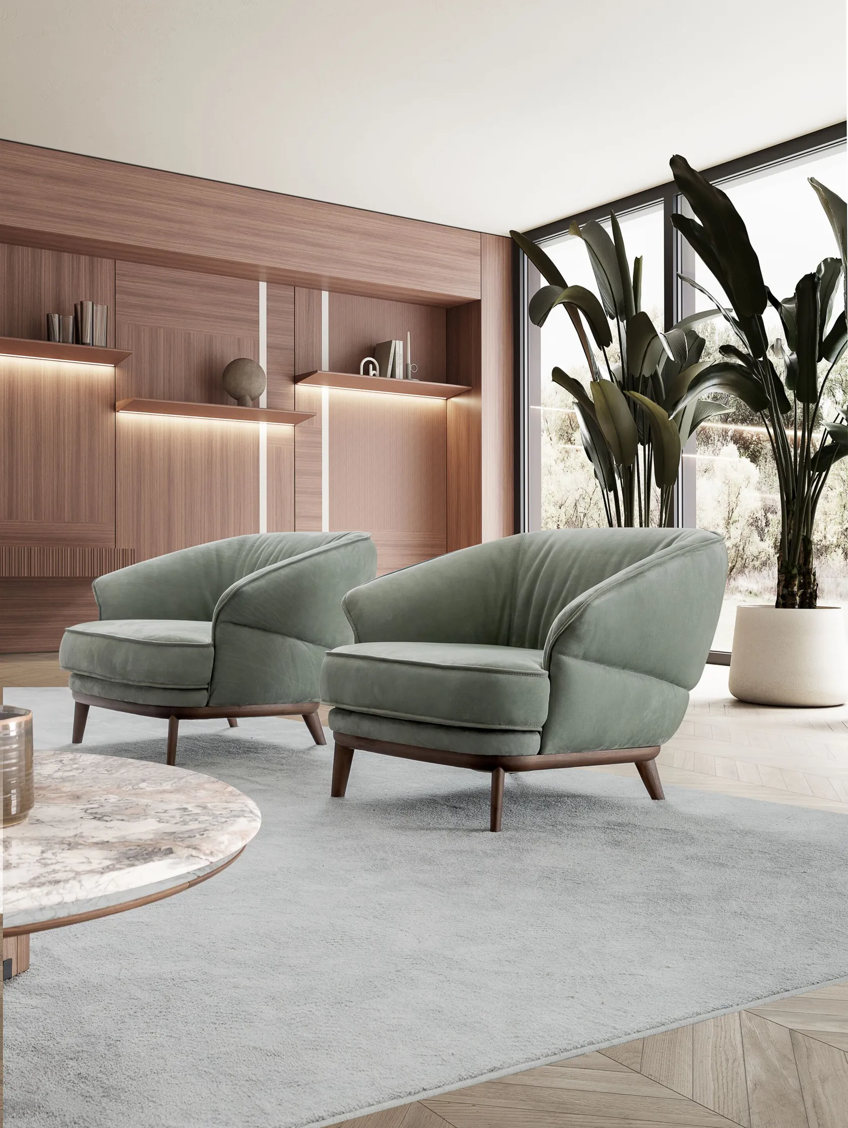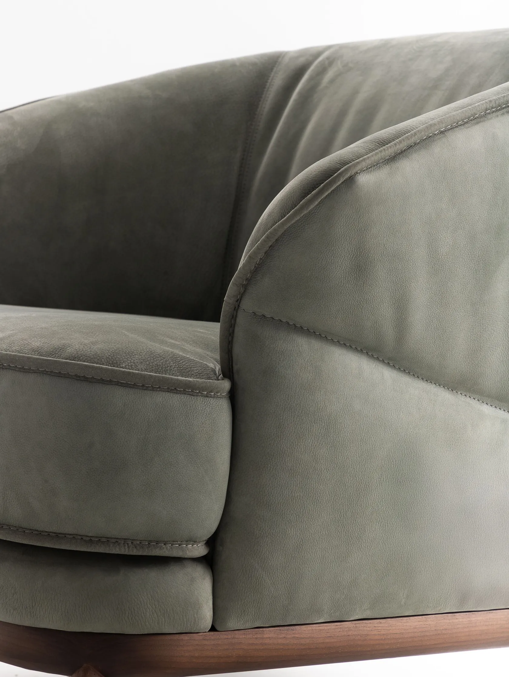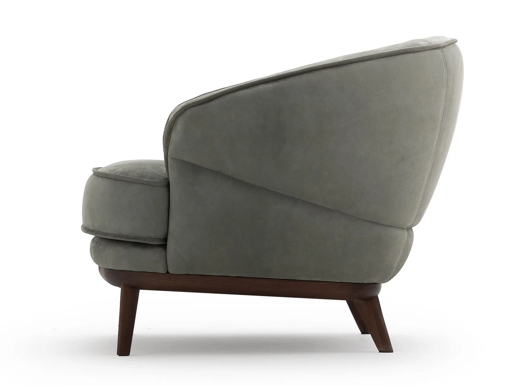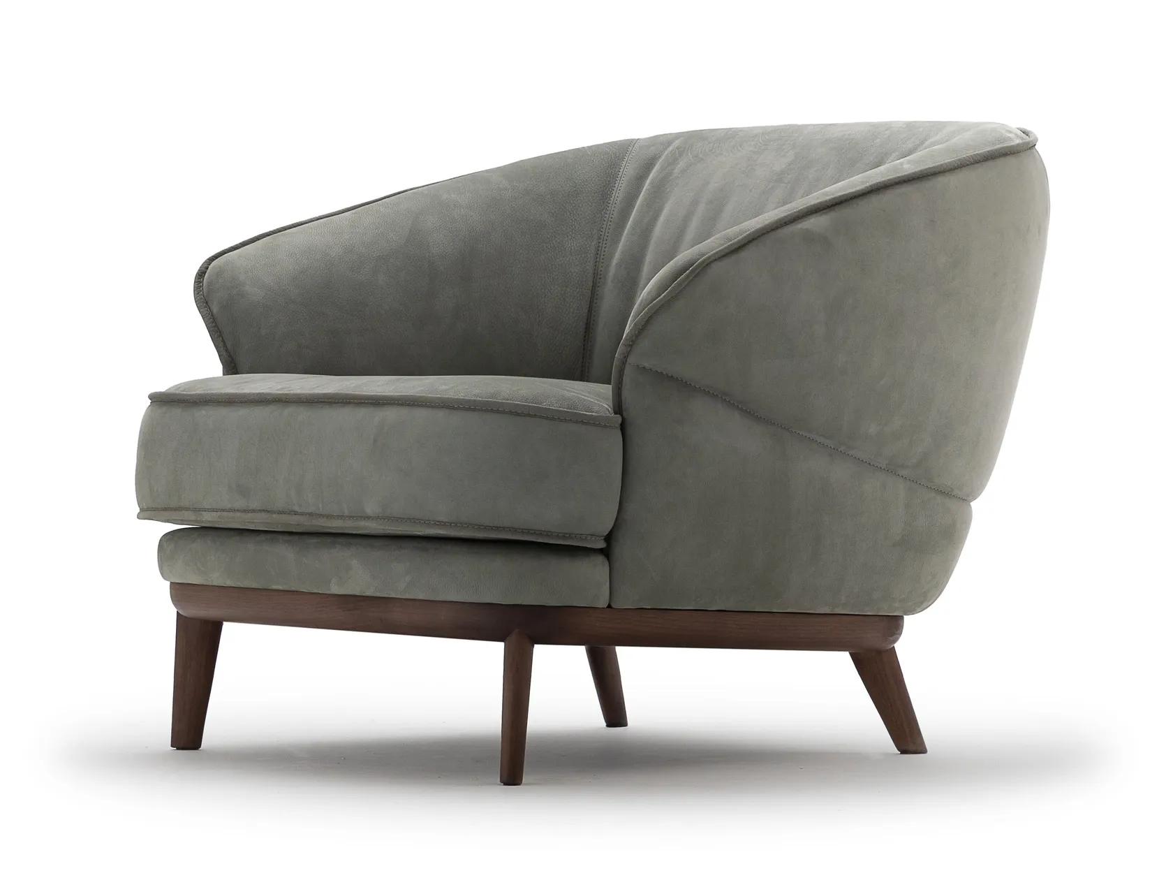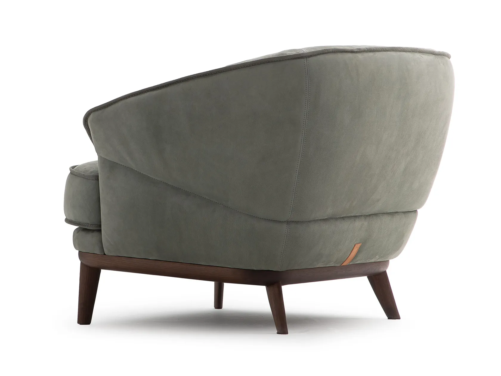 Its soft, flowing shape invites relaxation, while the Malva leather upholstery—as shown in the photo—enhances its warm, natural character.
