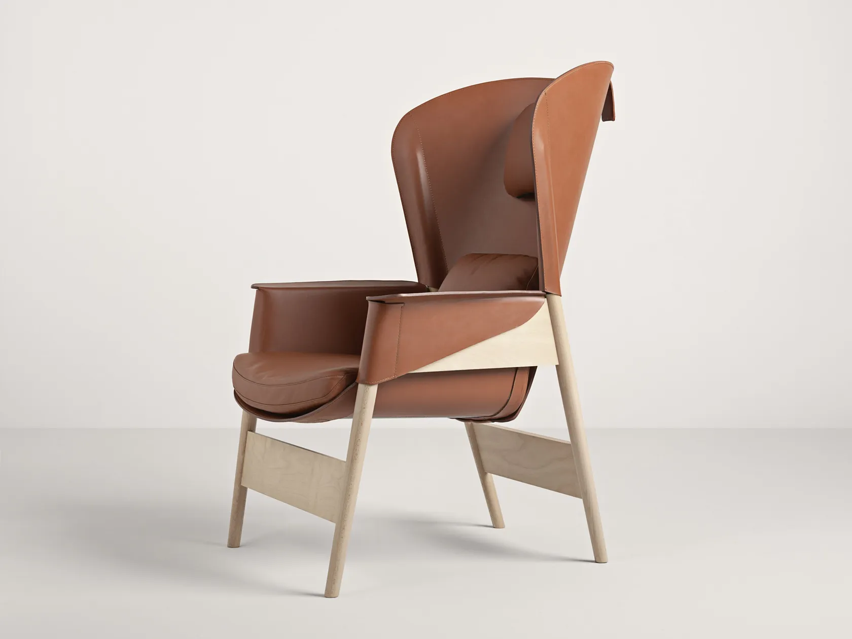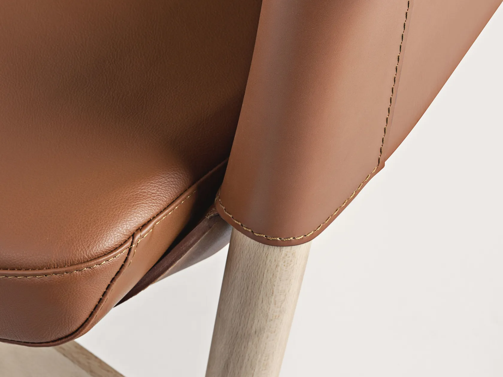 HETA is a bergère armchair defined by an H-shaped beechwood structure that supports the tailored saddle leather upholstery, seemingly suspended on slender stilts.‎ A contemporary reinterpretation of the traditional bergère, HETA combines structural rigour with enveloping comfort, resulting in a refined and timeless piece designed for moments of relaxation.‎