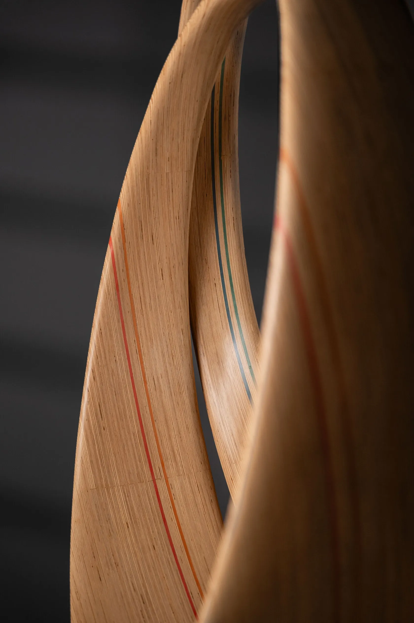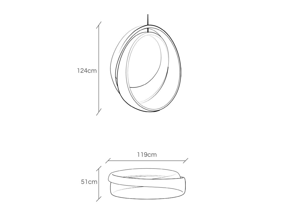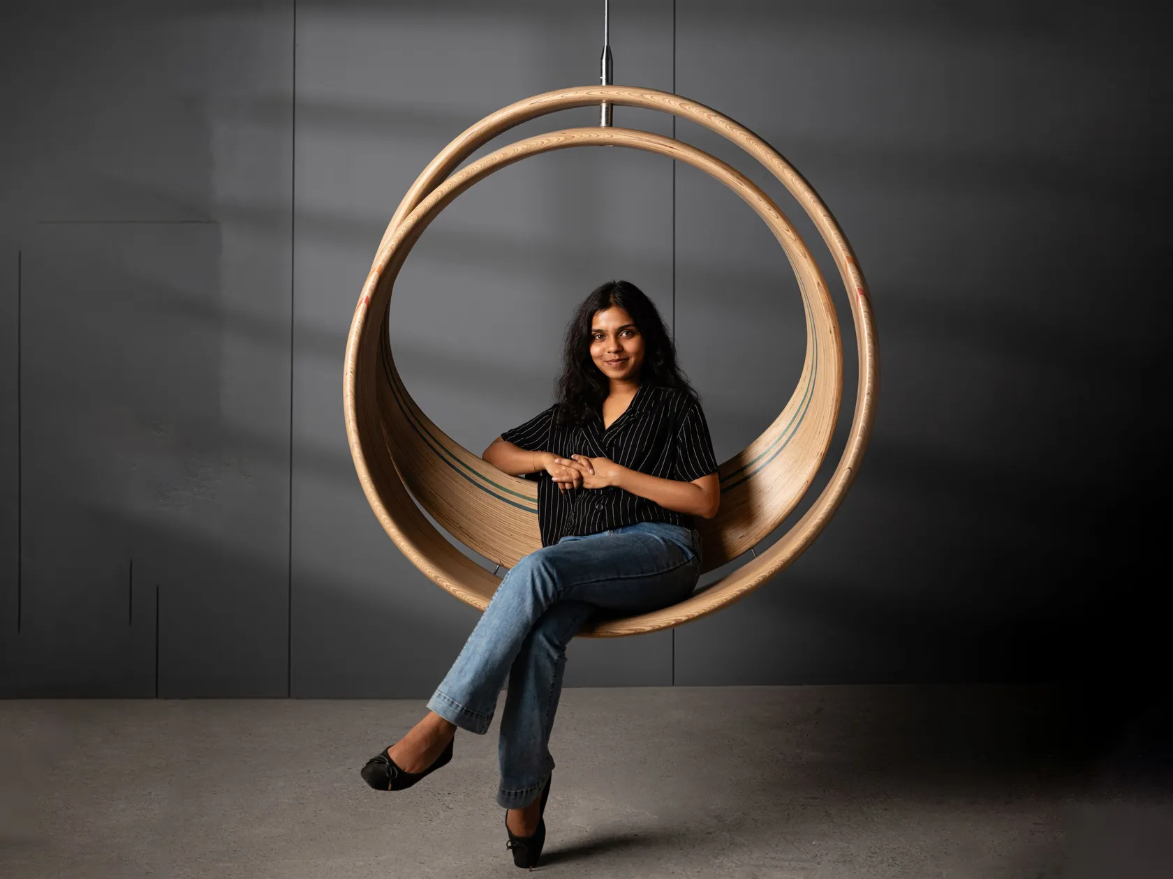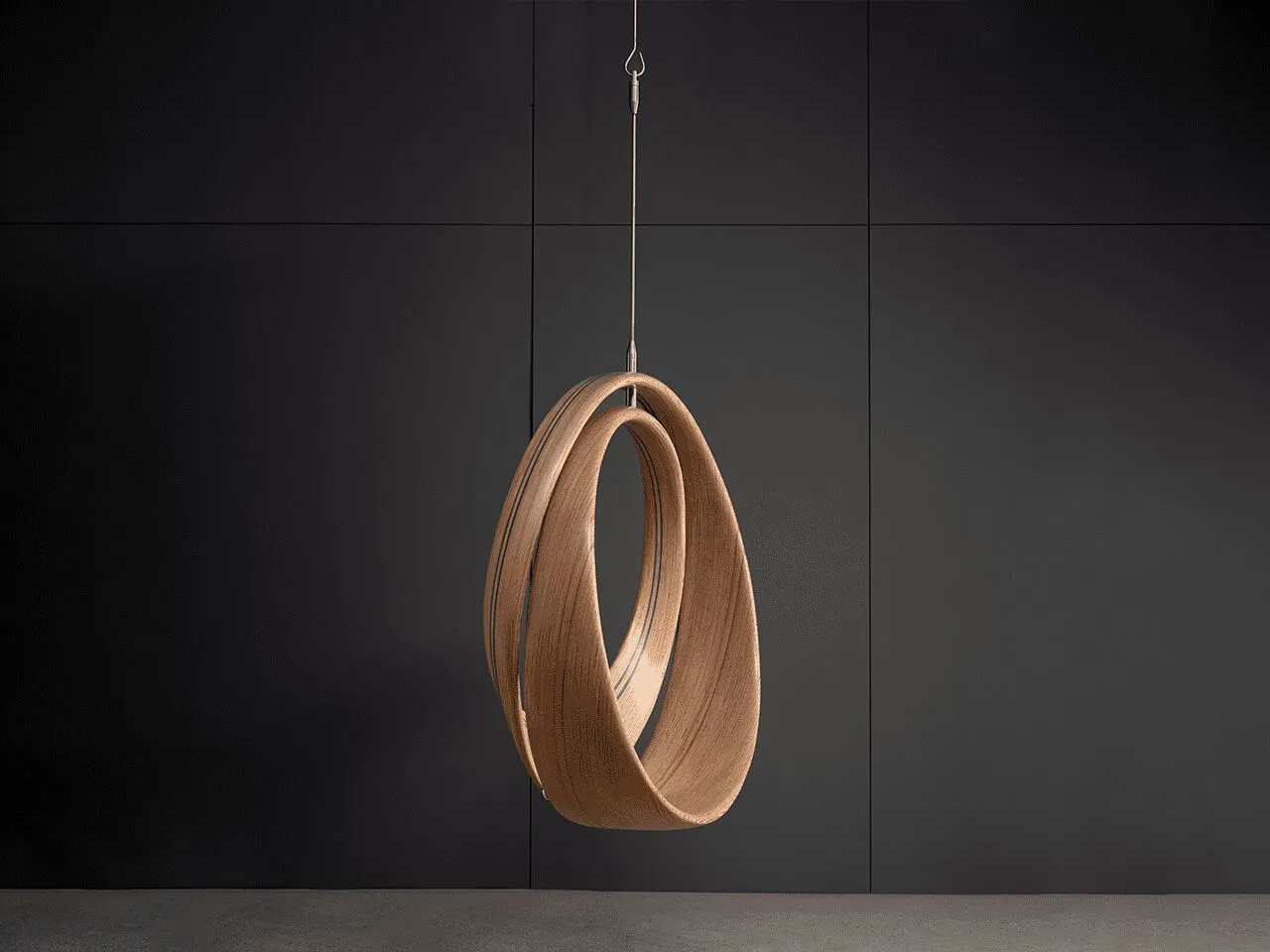 The LOOP spiral jhoola is formed as a double-loop configuration where one curve supports the seat and the other the backrest. Constructed in birch plywood, the geometry distributes load evenly while allowing suspended movement. The piece functions as a sculptural swing within interior spaces.