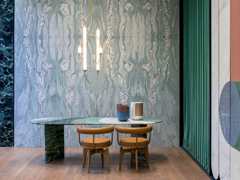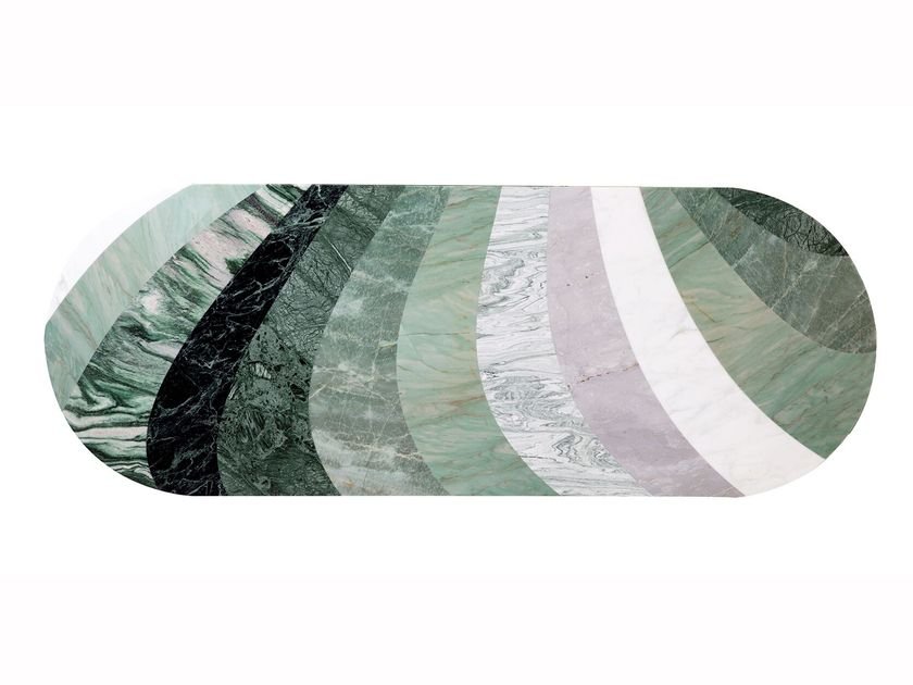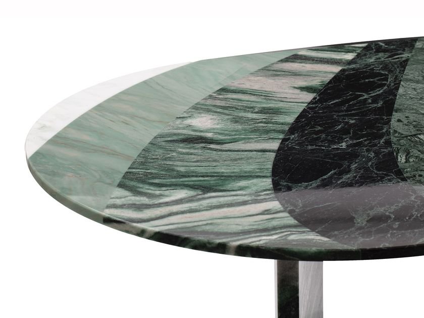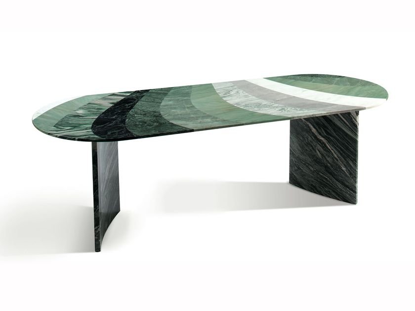 Marea Table, an exercise of soft shapes in shades of green. The biscuit-shaped table top features amazing colours and strong veins
