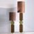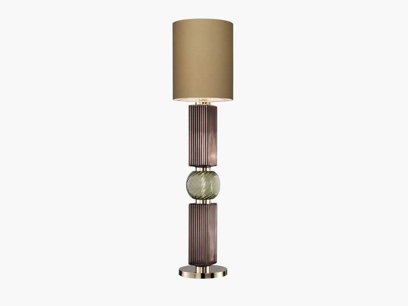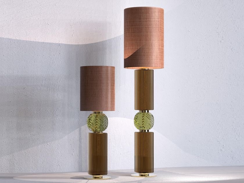 Matilda is a LED floor lamp characterized by a metal structure with light gold finish, lampshade in brown Sorya fabric, supported by a blown glass body, availble in two colors: green and yellow.‎