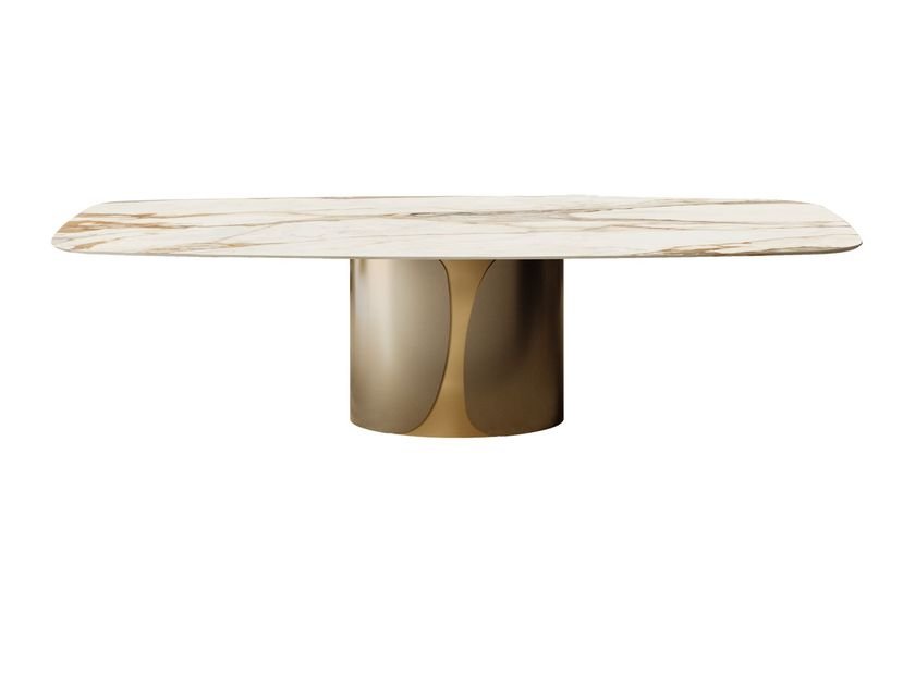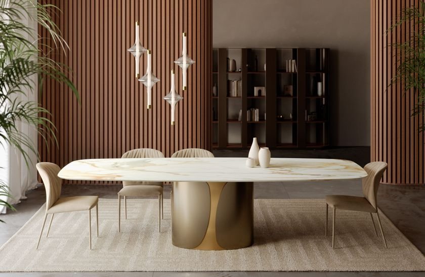 Talos is a table that commands space with solid elegance and architectural presence. Its defining feature is the monolithic elliptical base, composed of two symmetrical shells that embrace the central body. In the metal version, the base stands out for its refined colour combinations, creating either visual vibrations or sophisticated tone-on-tone effects. In the alternation between metal and wood, on the other hand, the warmth of natural materials merges with the sheen of metallic finishes, achieving a harmonious balance between texture and precision