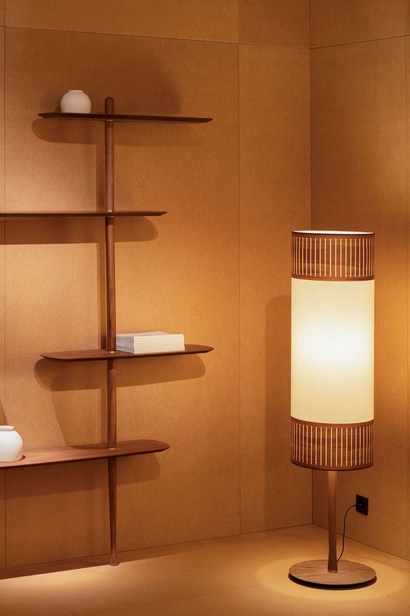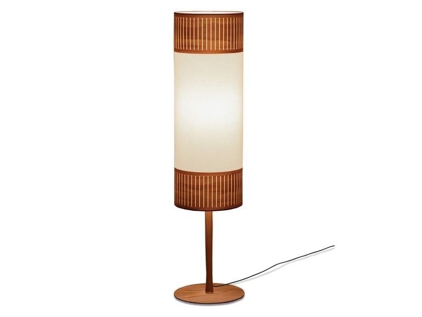Tamiz Floor is a floor lamp designed for indoor use only.‎ The lampshade combines fabric and natural wood veneer with a walnut finish, providing an even diffusion of light.‎