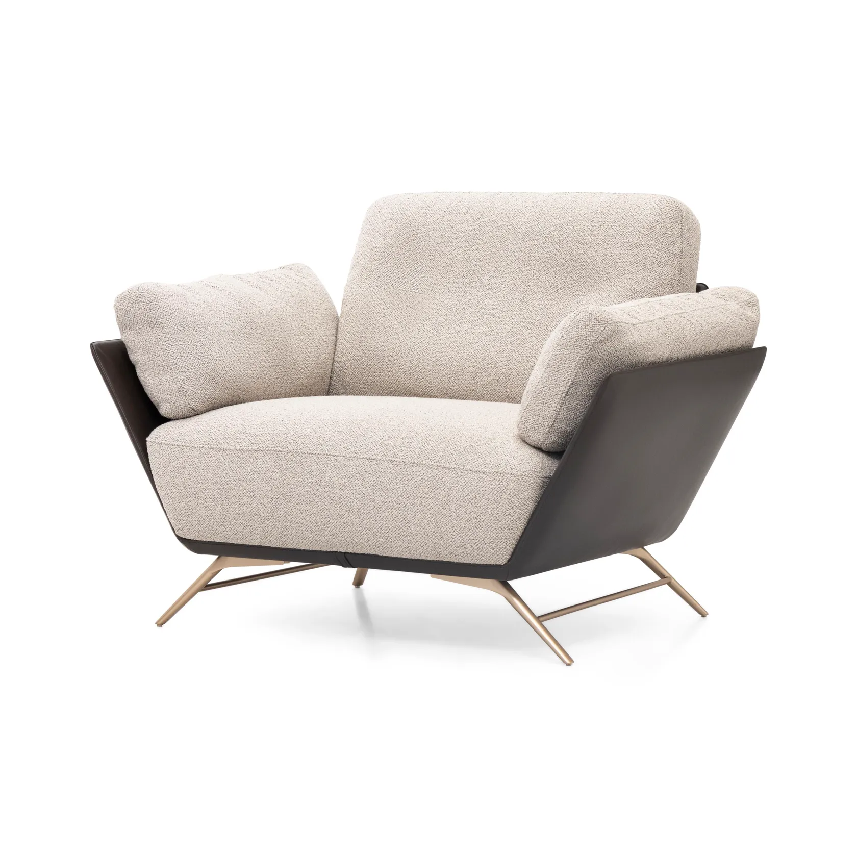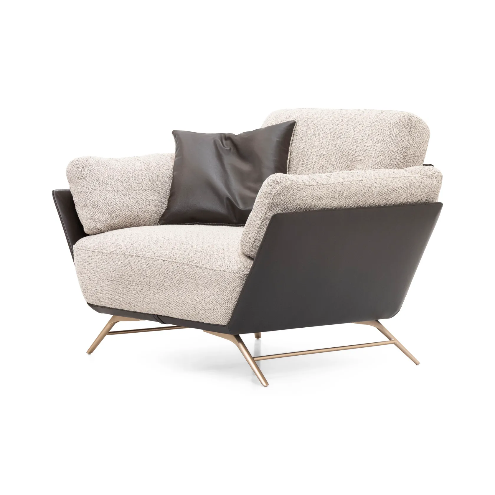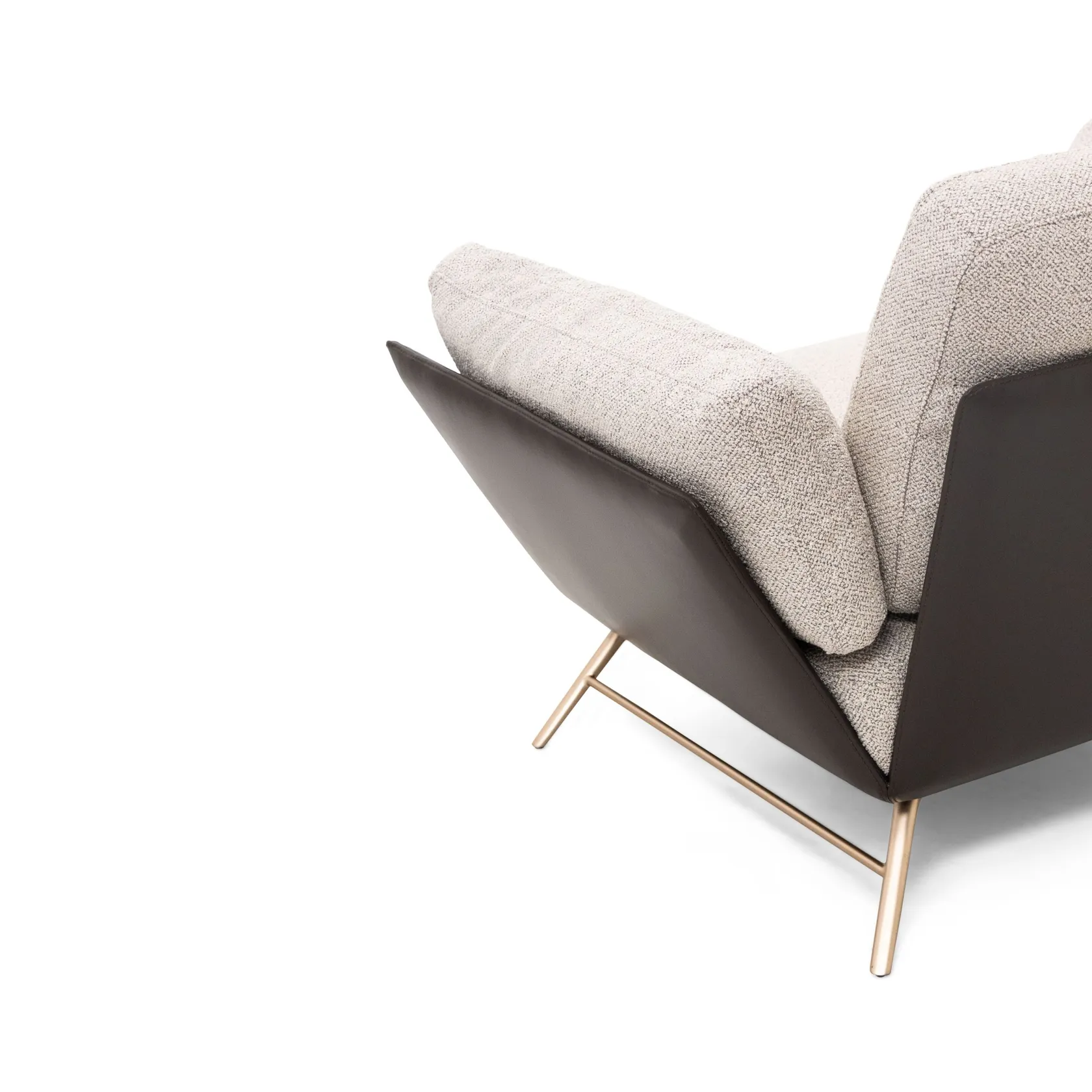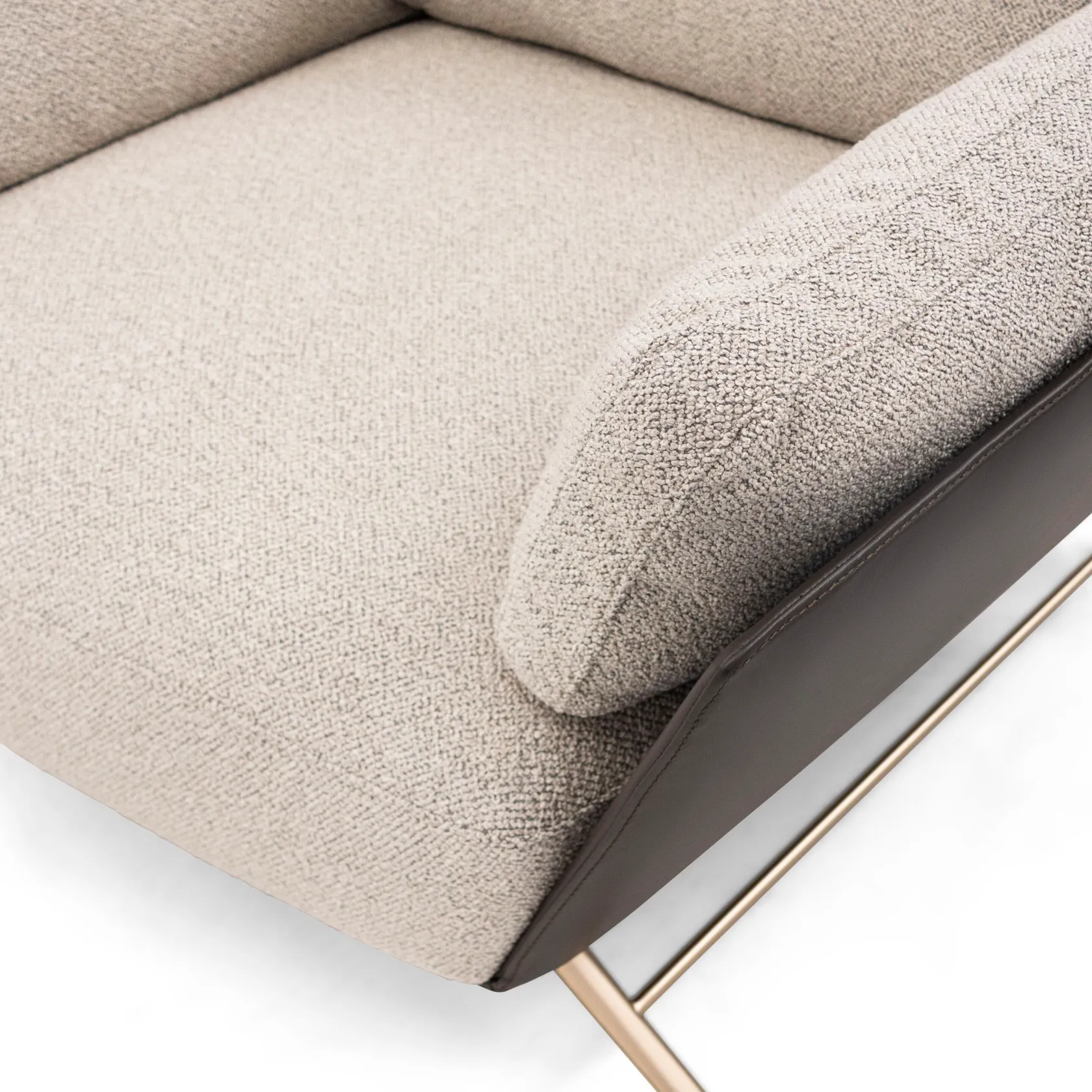 In fabric art. Ghero col. 01 Polvere, tone on tone stitching, outback in leather art. Daino col. Chestnut, tone on tone stitching, metal base in golden copper 69 finish.